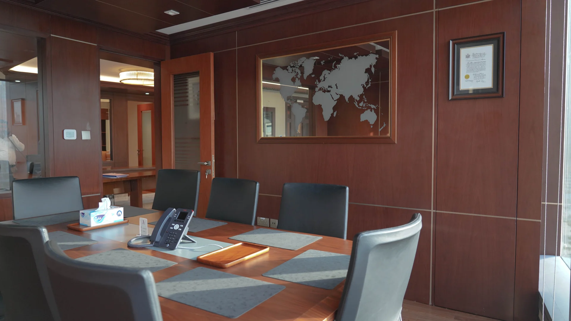 Monolith delivered a full fit-out for Al-Aidarous Advocates & Legal Consultants in Abu Dhabi, crafting a distinguished legal environment defined by rich mahogany woodwork, bespoke joinery, and classical detailing — a space that commands authority and instils confidence from the moment clients walk through the door.