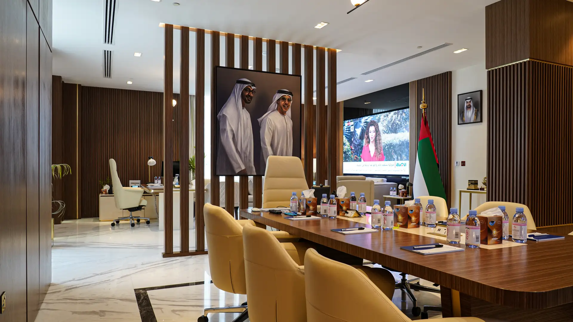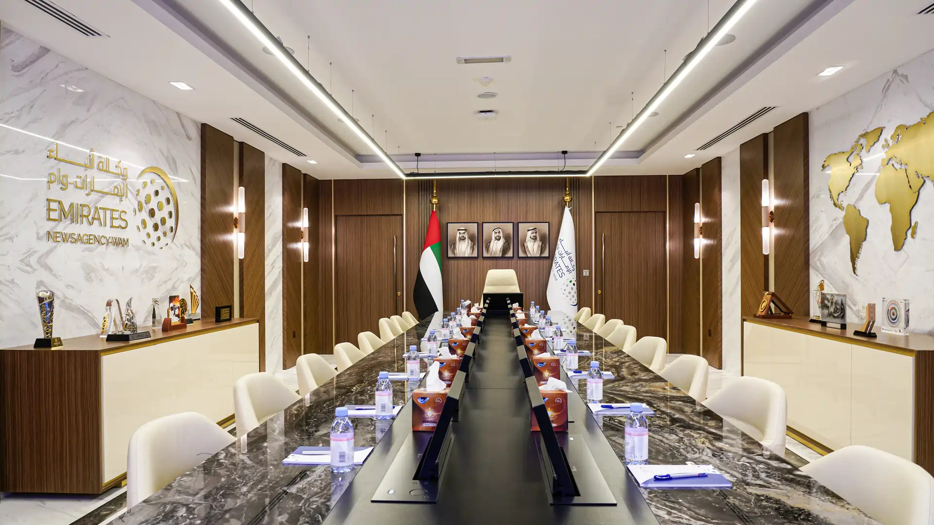 Monolith delivered a refined and functional interior transformation for the Emirates News Agency (WAM), seamlessly aligning aesthetic elegance with operational excellence. The implementation focused on high-end finishes, custom furnishings, and integrated lighting solutions that offer both ambiance and clarity. From the plush conference seating and rich marble surfaces to the dynamic acoustic paneling and tailored workstation layouts, every detail reinforces the identity of a premium national media agency. The color palette, material textures, and spatial rhythm were carefully selected to enhance brand presence and professionalism across editorial rooms, studios, and executive spaces.