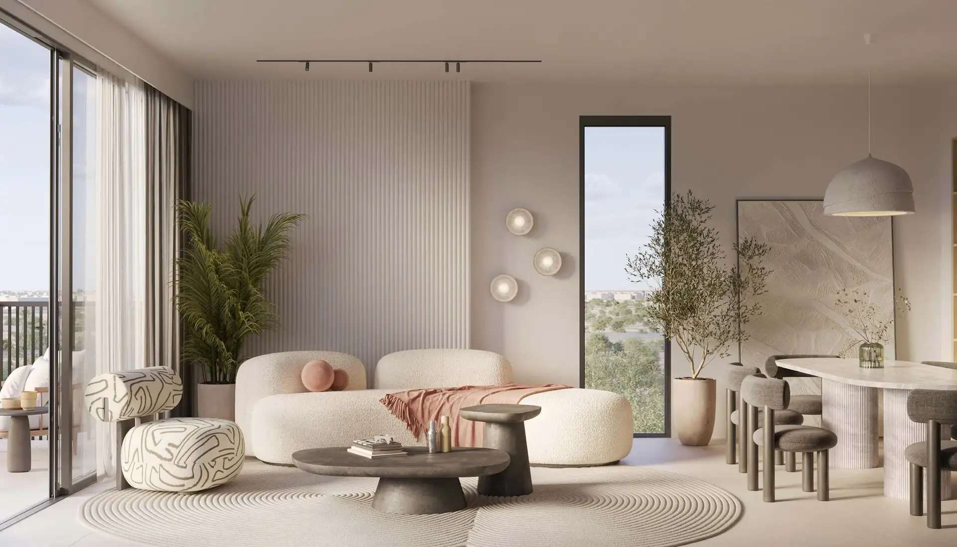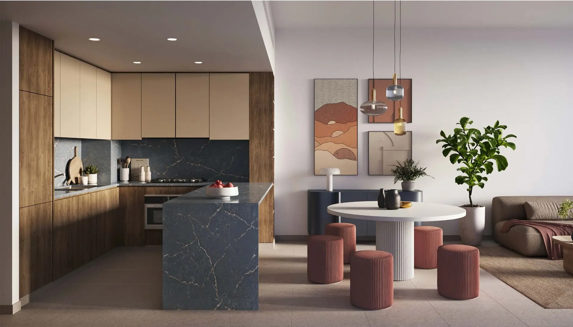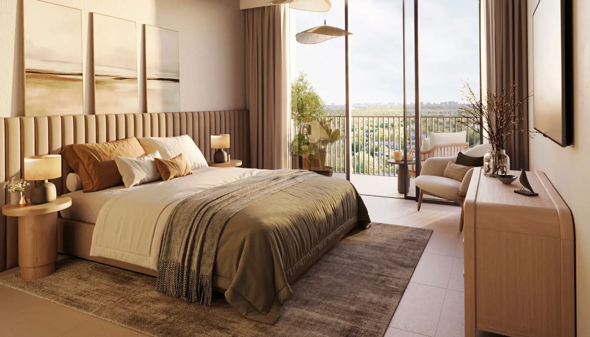 Ghaf Woods is conceived as a biophilic urban sanctuary a community where architecture, landscape, and interior design work in harmony to bring residents closer to nature. Monolith's joinery scope was approached with this philosophy at its core: every cabinet, every door, every built-in unit was designed and crafted to complement the development's organic material palette of natural wood tones, warm neutrals, and tactile finishes that echo the surrounding landscape.