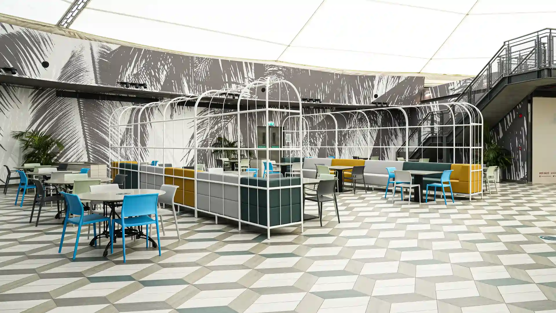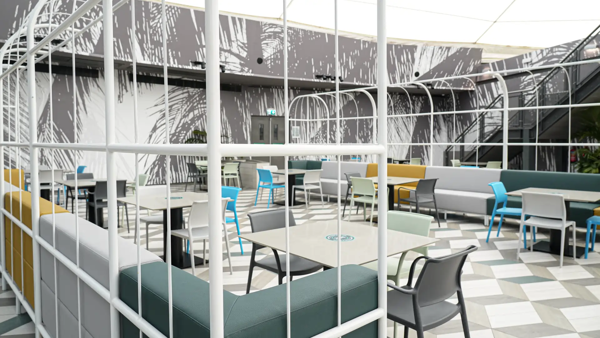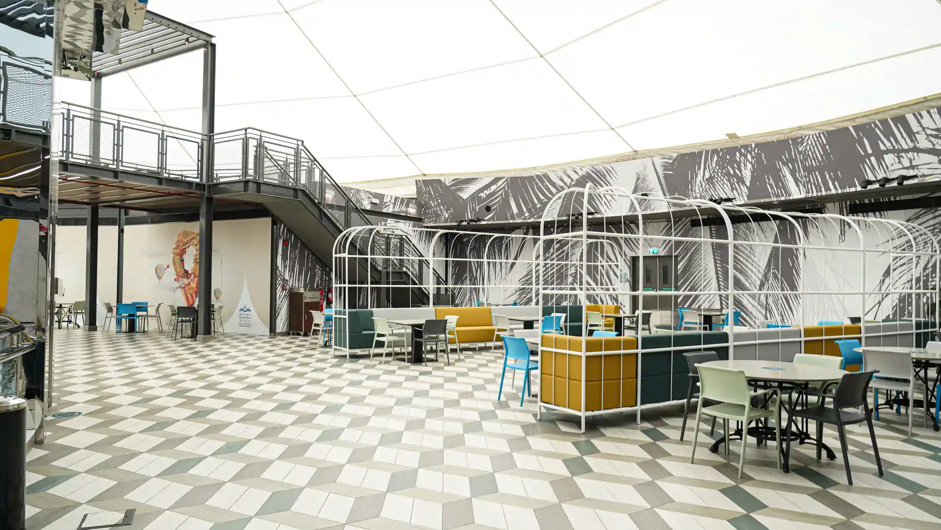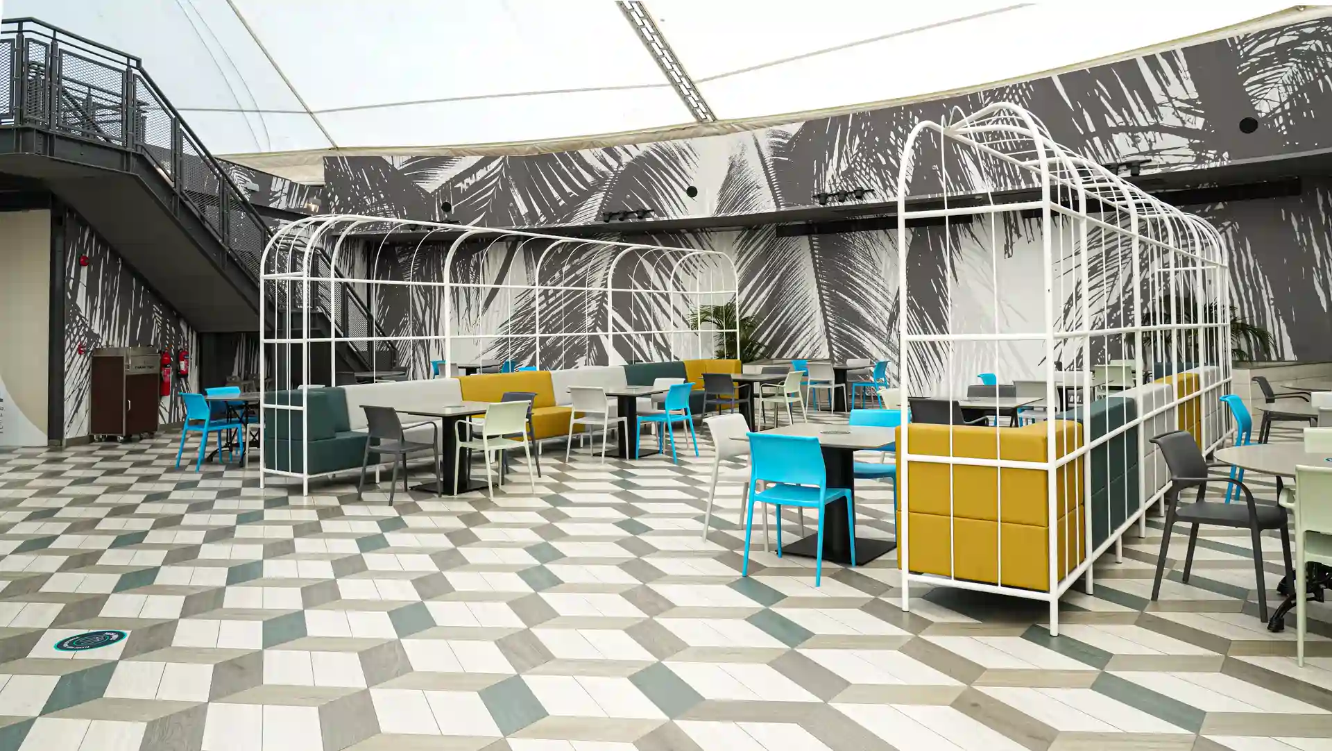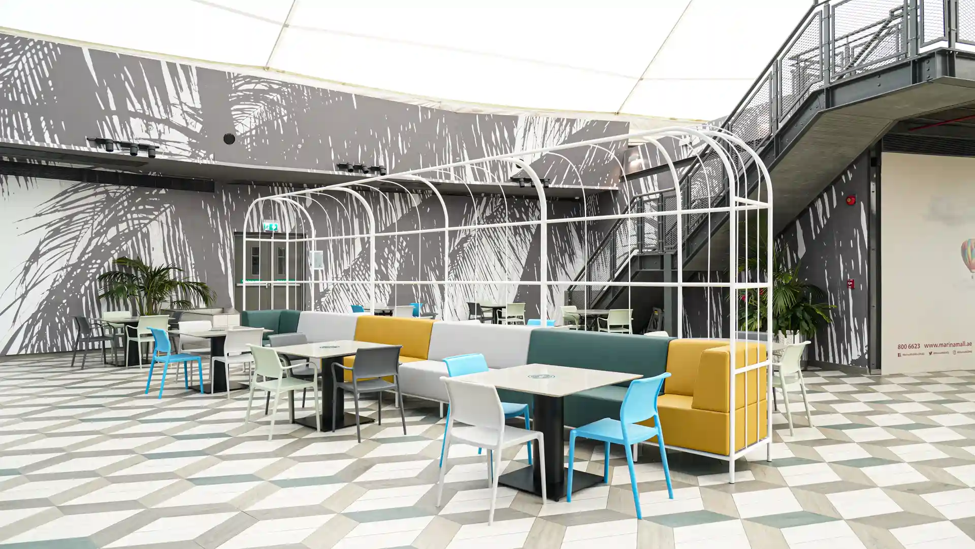 The renovation concept was built around a single bold idea: transforming a standard mall food court into a destination space that visitors actively seek out. Monolith responded with a tropical urban aesthetic large-scale monochrome palm-leaf murals wrapping the full perimeter of the circular space, a geometric hexagonal tile floor in layered grey tones, and a vibrant palette of teal, mustard, sky blue, and sage that brings energy and warmth to every corner. The bespoke white powder-coated steel arch pergola structures — running in parallel rows down the length of the space create a sense of arrival and journey that makes the space feel curated and intentional.