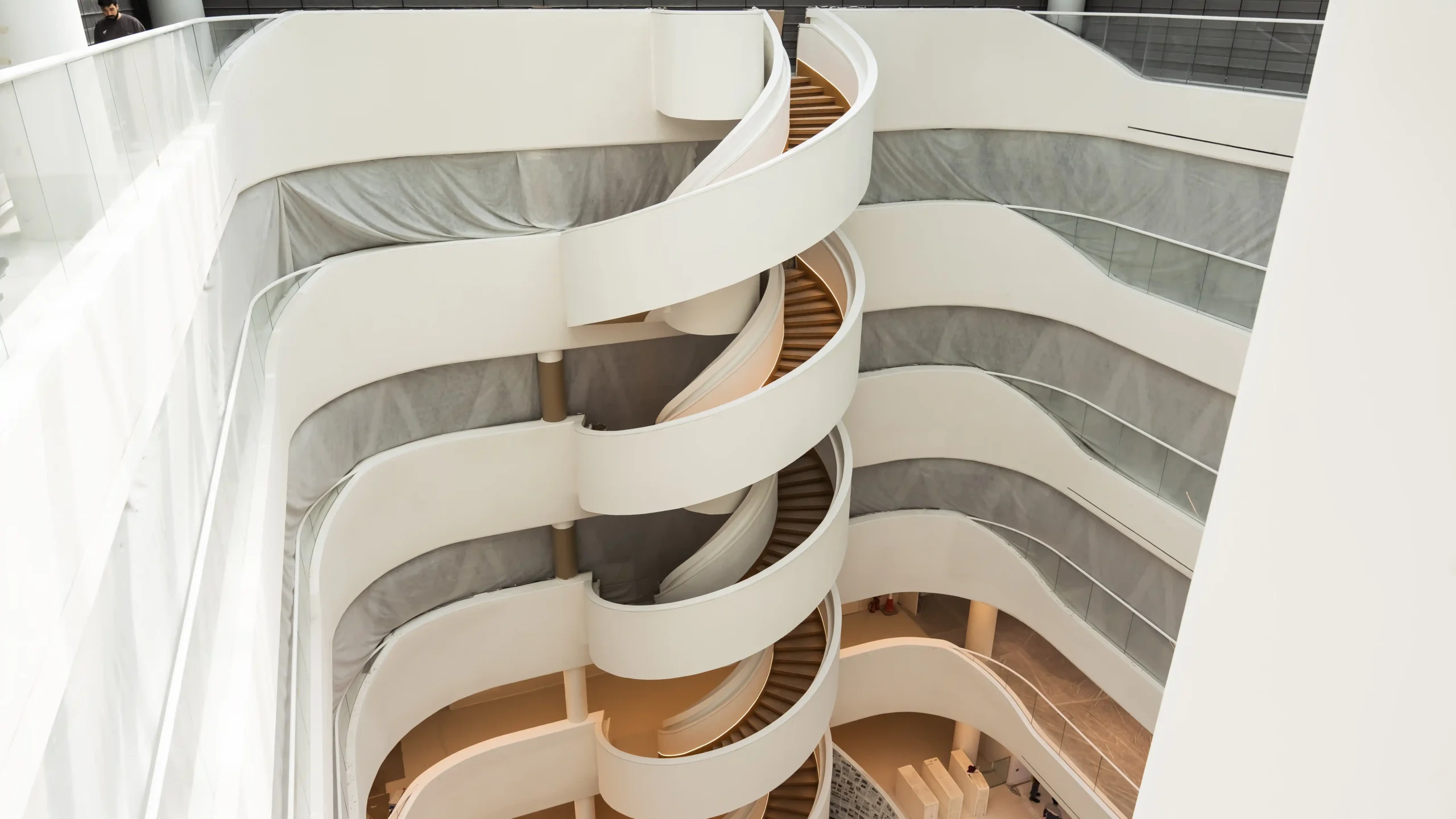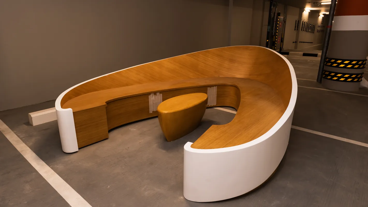 At Masdar City, Monolith crafted a striking spiral staircase defined by smooth curves and a clean, sculptural form, primarily built from wood. The staircase anchors the reception area beneath it, creating a seamless architectural focal point. Monolith also delivered the surrounding wooden wall finishes, bathroom vanity mirror detailing, and elements within the prayer room, ensuring a consistent material language and refined simplicity throughout the space.