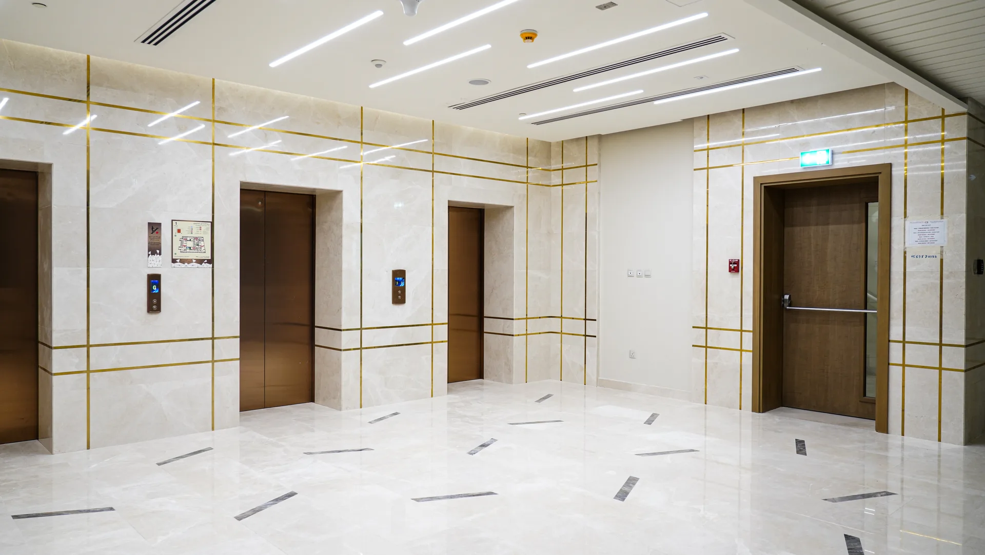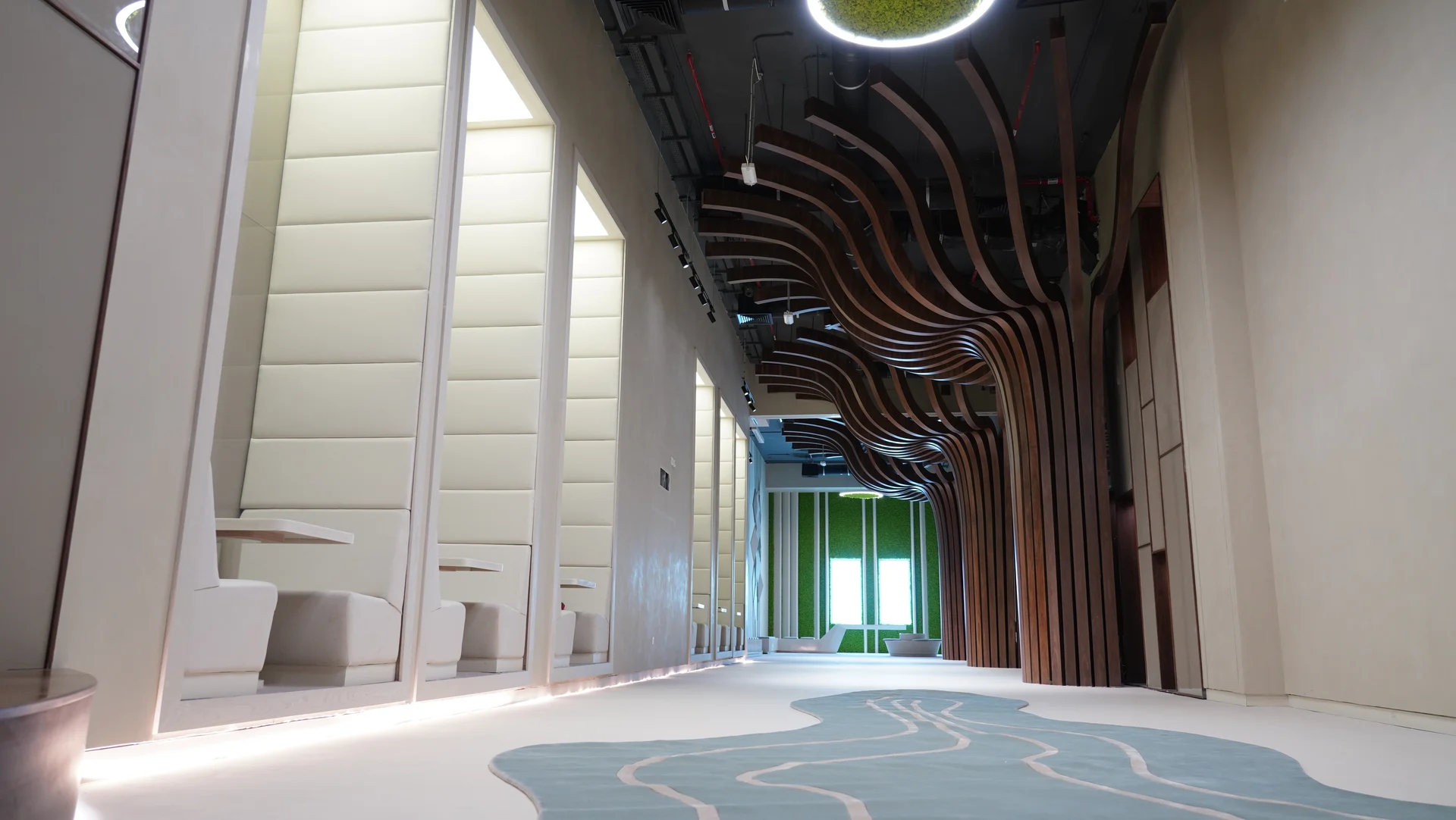 The Public Prosecutor Office and Open Space blends ultra-modern minimalism with biophilic inspiration. Its clean geometry, high-acoustic padded niches, and earthy wood accents bring sophistication and warmth to a space that demands both focus and calm. Integrated lighting beneath the floating seating platforms and the soft blue organic carpets creates a tranquil, futuristic vibe. Sculptural wooden ceiling elements flow seamlessly into the walls, providing architectural elegance and continuity across zones.