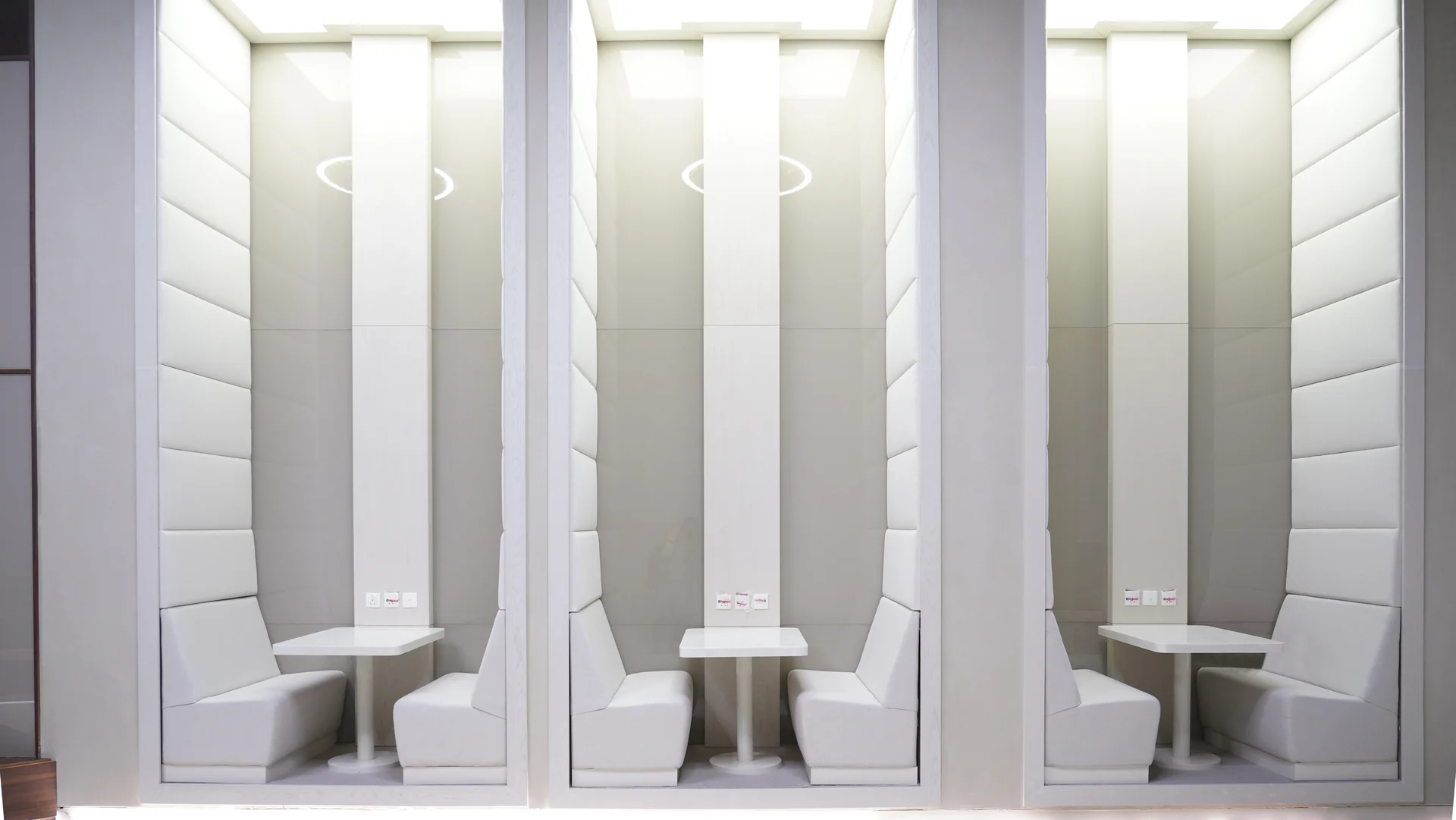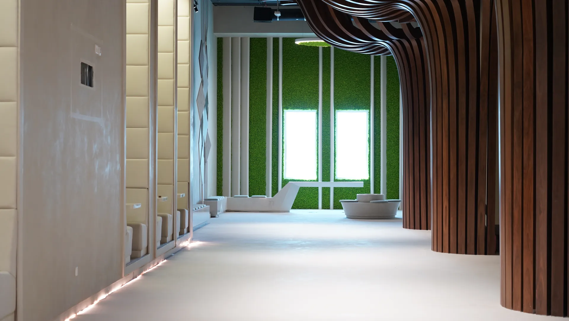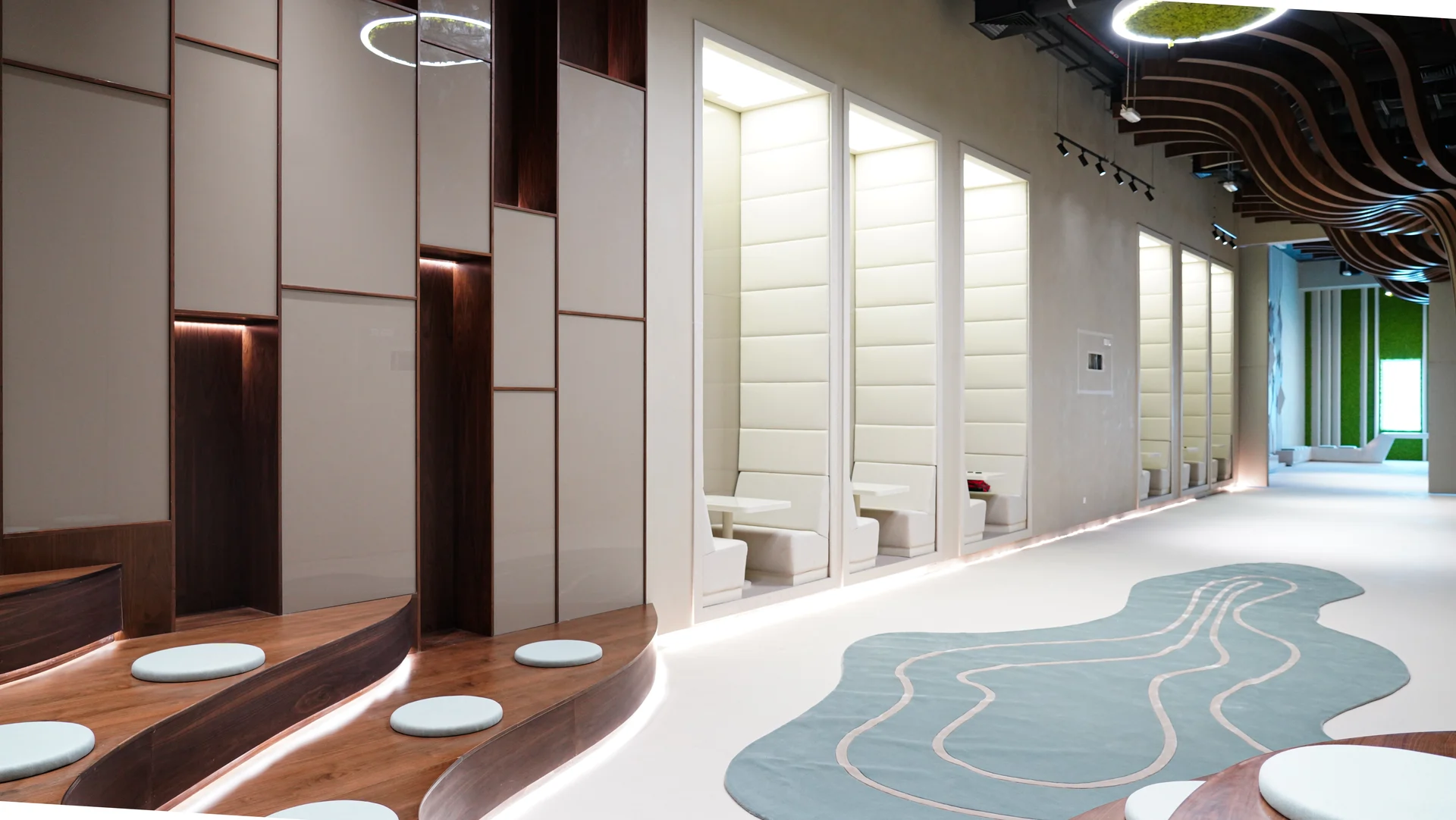 Monolith envisioned a public legal and communal space that supports both private consultation and public presentation. The layout encourages motion and flow, separating acoustic pods for individual conversations from amphitheater-style seating for larger gatherings or talks. The material palette of warm wood, white leather panels, soft curves, and green accents reflects harmony between justice, clarity, and innovation. Every surface, curve, and transition was meticulously planned to enhance both functionality and aesthetic quality.