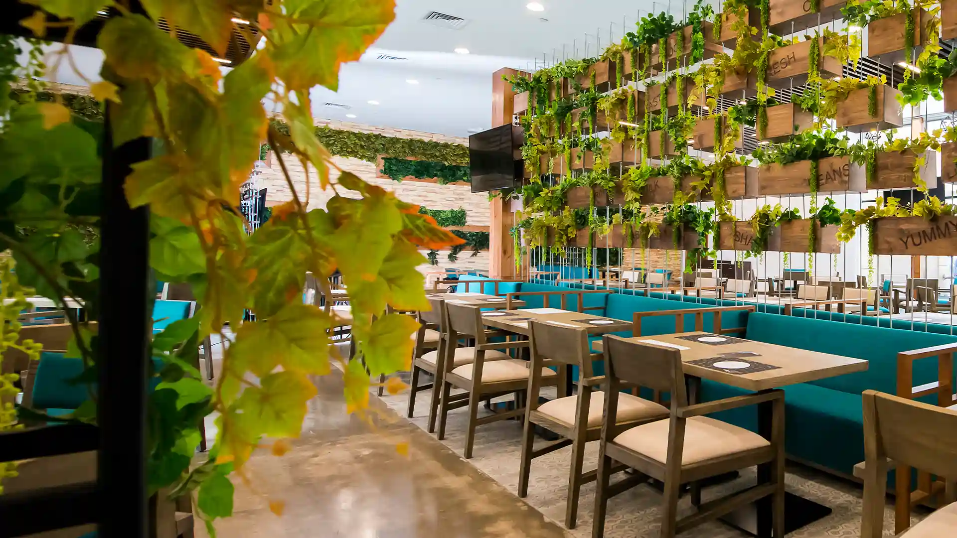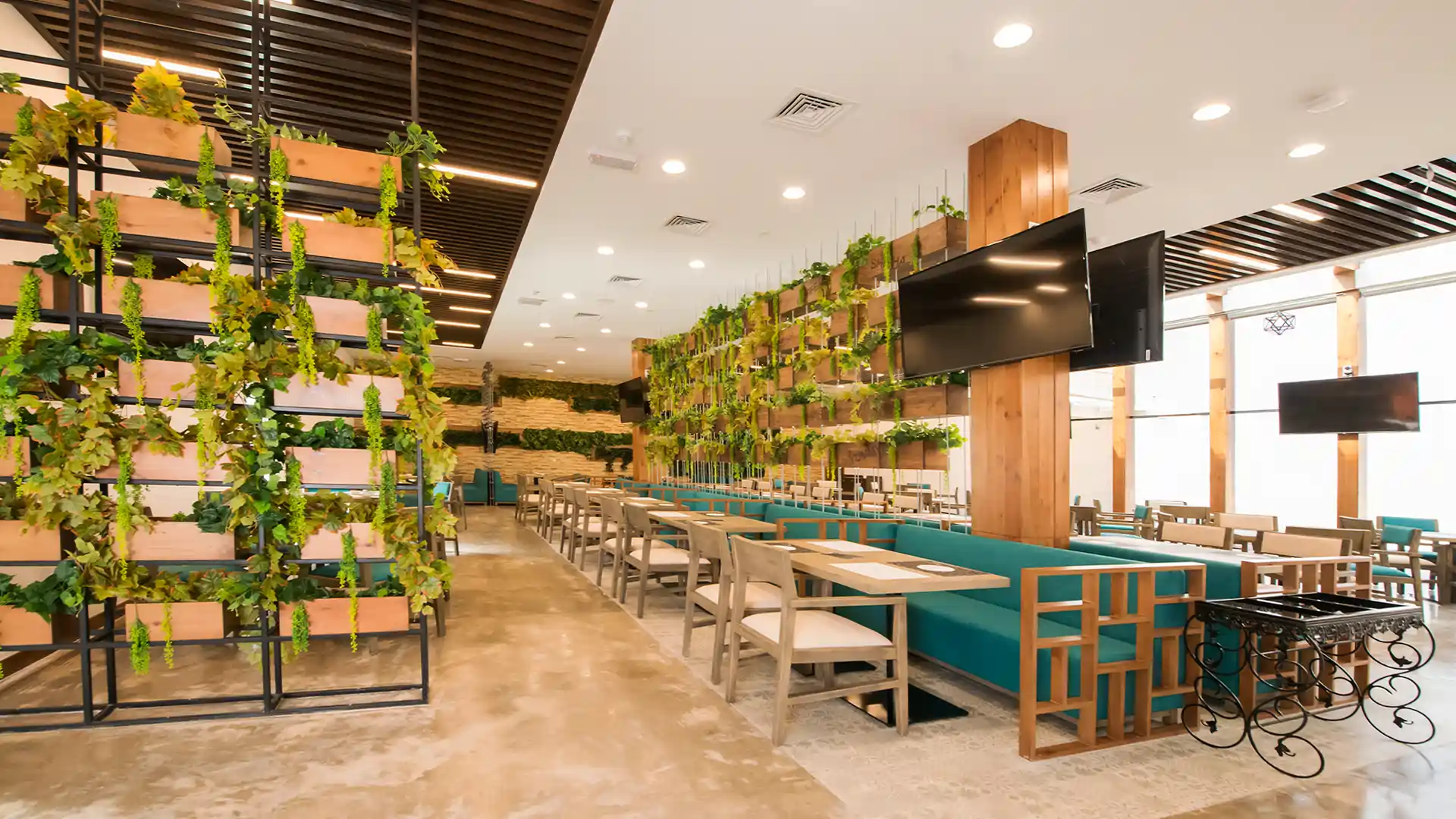 The design concept was built around a single powerful idea: bringing the garden inside. Monolith created a dramatic overhead installation of custom timber crate shelving units, each overflowing with cascading green foliage, that spans the full length of the dining room and transforms the ceiling plane into a living, breathing canopy. Combined with vertical green walls, natural stone cladding, and warm timber structural columns, the result is a restaurant that feels like dining in an urban garden — vibrant, fresh, and completely unlike anything else in the mall.
