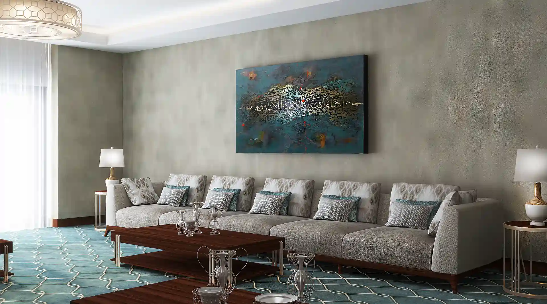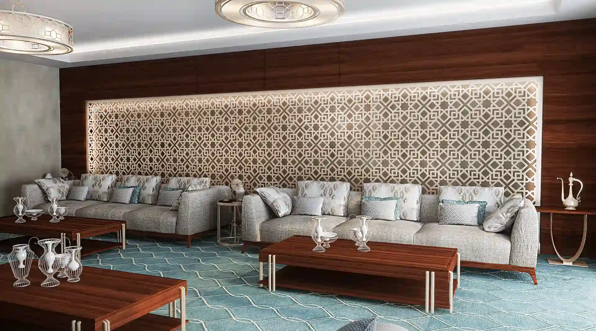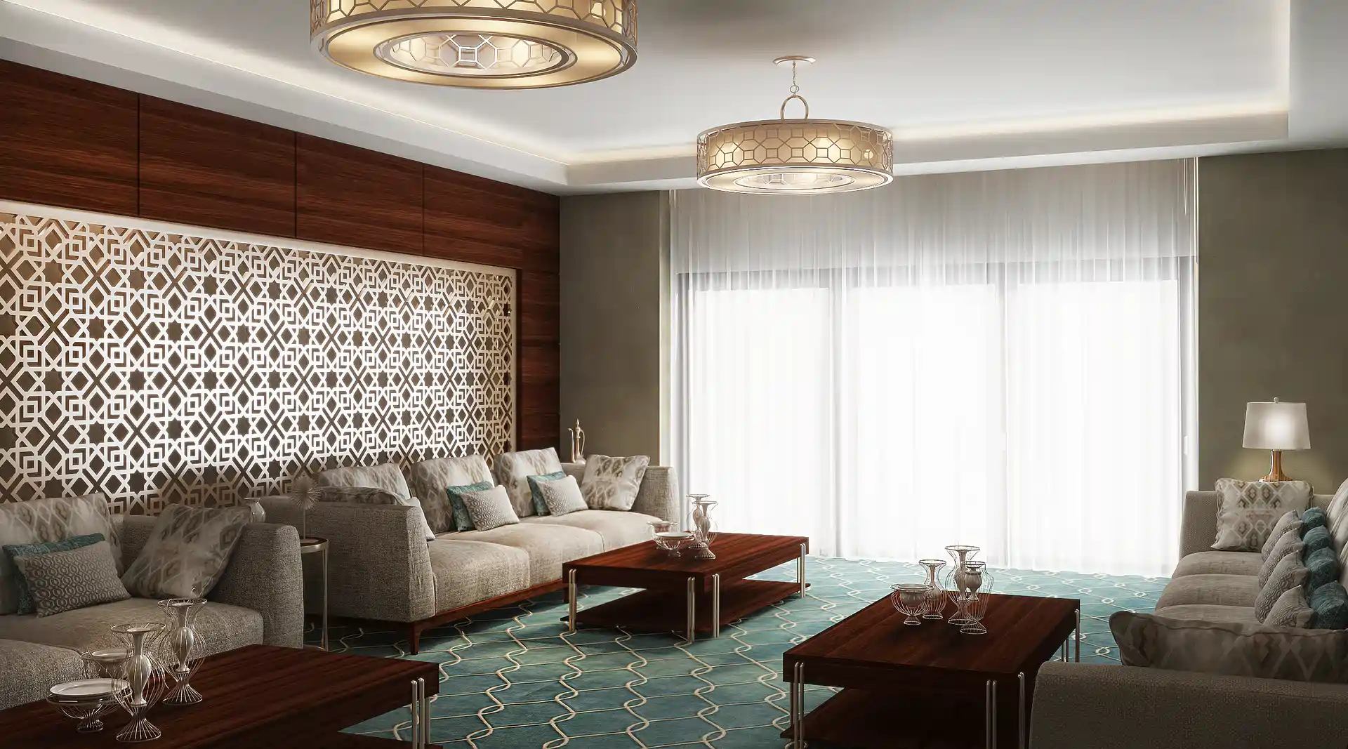 The execution of the VIP Majlis involved sourcing premium materials such as high-gloss marble, natural wood tones, velvet textiles, and gold accents. Each element was carefully installed to maintain symmetry and functionality, with styling decisions rooted in cultural respect, spatial balance, and luxury hospitality. Lighting was layered to enhance the ambiance, with spotlights, pendants, and natural daylight all playing a vital role.
